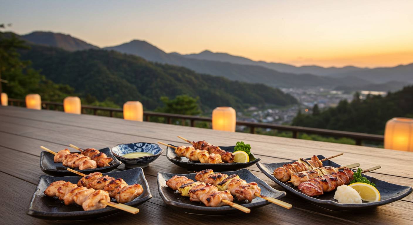 絶景と共に焼鳥を味わいたい場合は、強羅駅から徒歩3分の「やきとり家 だいご匠」がおすすめです。こちらは絶景の窓席はありませんが、紀州備長炭で丁寧に焼き上げる本格的な焼鳥が絶品。地元の酒造の日本酒も豊富に揃っており、上質な焼鳥と地酒の組み合わせを堪能できます。