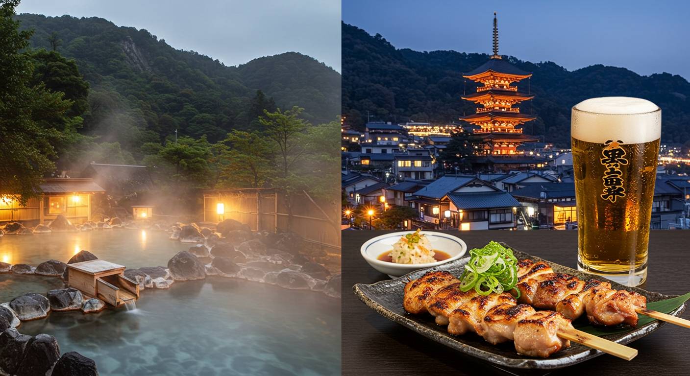 - 夕食:強羅の美食体験 大文字焼の前の完璧な食事には、**「田むら銀かつ亭」の豆腐かつ煮や、「炭火焼き 鳥寅」の本格焼鳥がおすすめです。「やきとり家 だいご匠」**も、落ち着いた雰囲気で上質な焼鳥が楽しめるため、デートの選択肢に加えても良いでしょう。